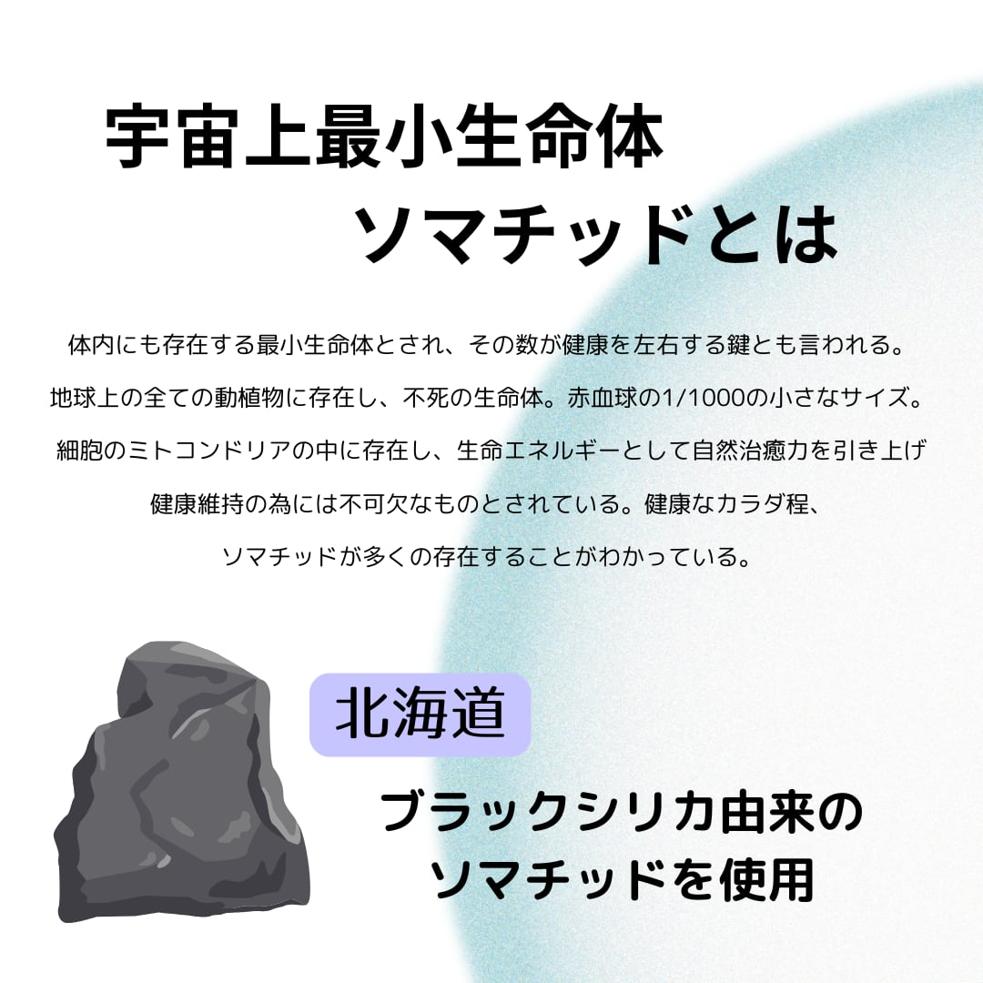 フィルターには古代ソマチッドが潜む北海道 上ノ国町のブラックシリカを内蔵し、ソマチッドの溶け出した水を身体に入れることで、免疫力の高い身体作りに役立ちます。